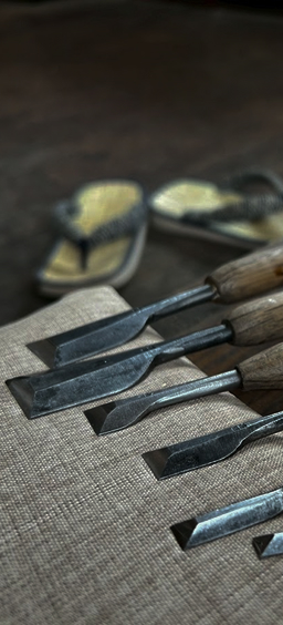 一本一本のノミと彫刻刀に魂を込め、荒彫りから仕上げ彫りまで丹念に仕上げるその技は、まさに匠の技。